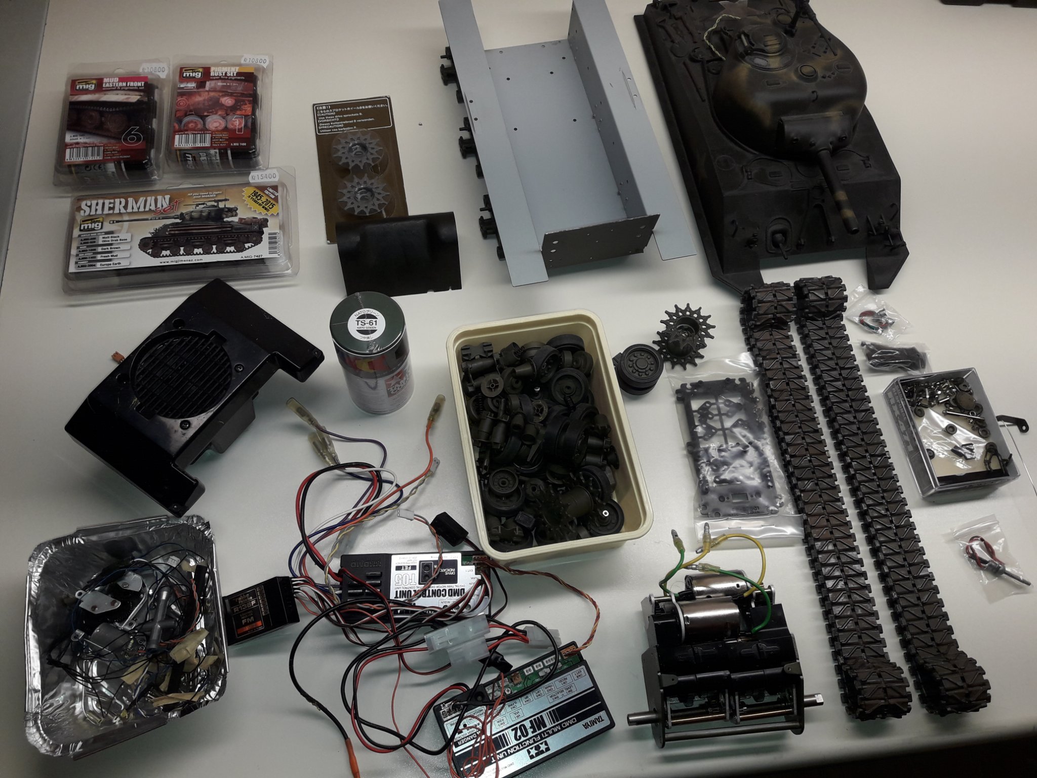 Köpte en begagnad Sherman skala 1/16 i delar. Svårigheterna här är att det är blandat delar från äldre modeller och nyare Tamiya 56014.