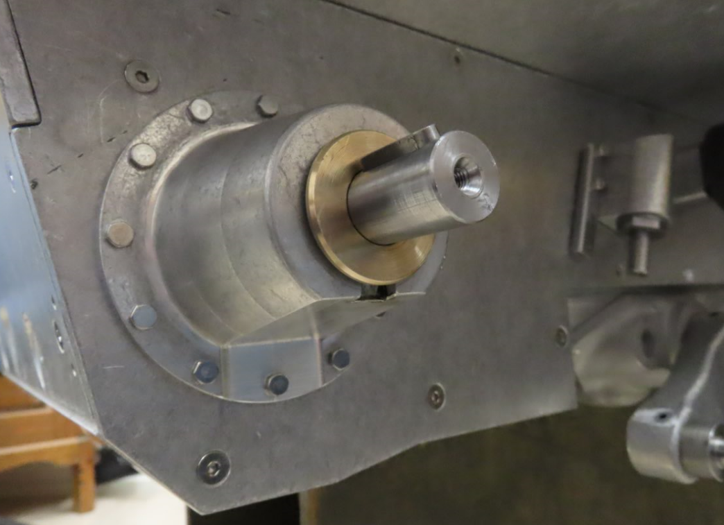 Pendelarmarna och hjulaxlarna är monterade på pendelaxlarna med en M12-gänga vilket innebär att dessa strävar att dra åt sig själva på vagnens högersida men att lossa sig själva på vänstersidan. En stoppskruv förväntas att låsa tillräckligt i kombination med Loctite. Skruven dras rakt ner i M12-gängan vilket lär innebära att om man skulle behöva ta isär senare så är risken stor att det skär ihop. Jag gjorde ett planförsänkt hål i axeln genom hålet för stoppskruven och använder en stoppskruv med plan ända.