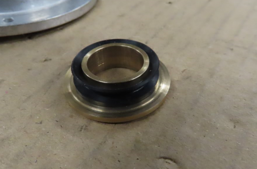 För att skydda mot smuts som kommer in till det yttre drivaxellagret så har jag tagit bort en del material i huset runt axeln så att en skyddsring, i mässing, med en V-ring får plats innanför drivhjulet. Ett spår i underkant släpper förhoppningsvis ut de små partiklar som letar sig in mellan hus och skyddsring. Ringens fläns ligger någon tiondel från huset när drivhjulet är monterat.