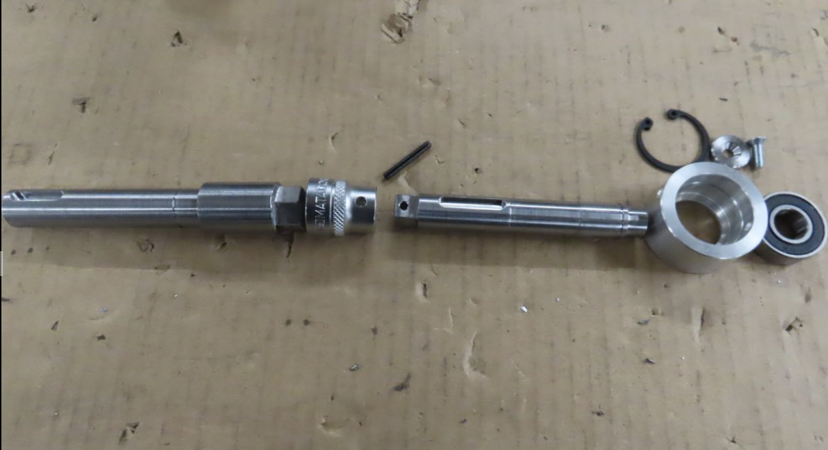 Den nya drivhjulsaxeln saknar kugghjul och är i sin inre ände sexkantig. För att hålla den på plats låses den axiellt inåt med en låsring mot inre axellagret som i sin tur är låst med två skruvar i drivhjulshuset. AT´s lösning med en mässingsknapp som håller emot inåt är inte användbar i min lösning.
