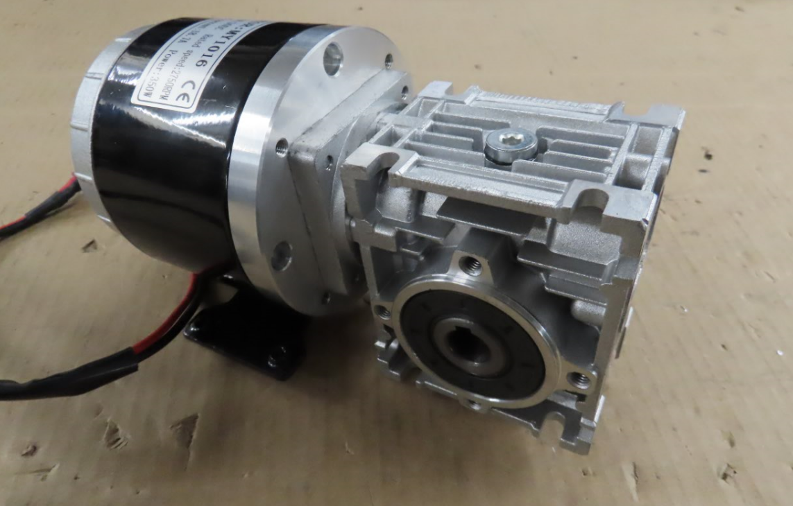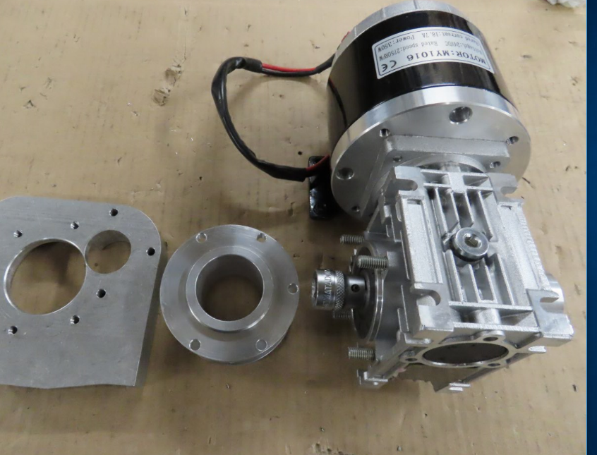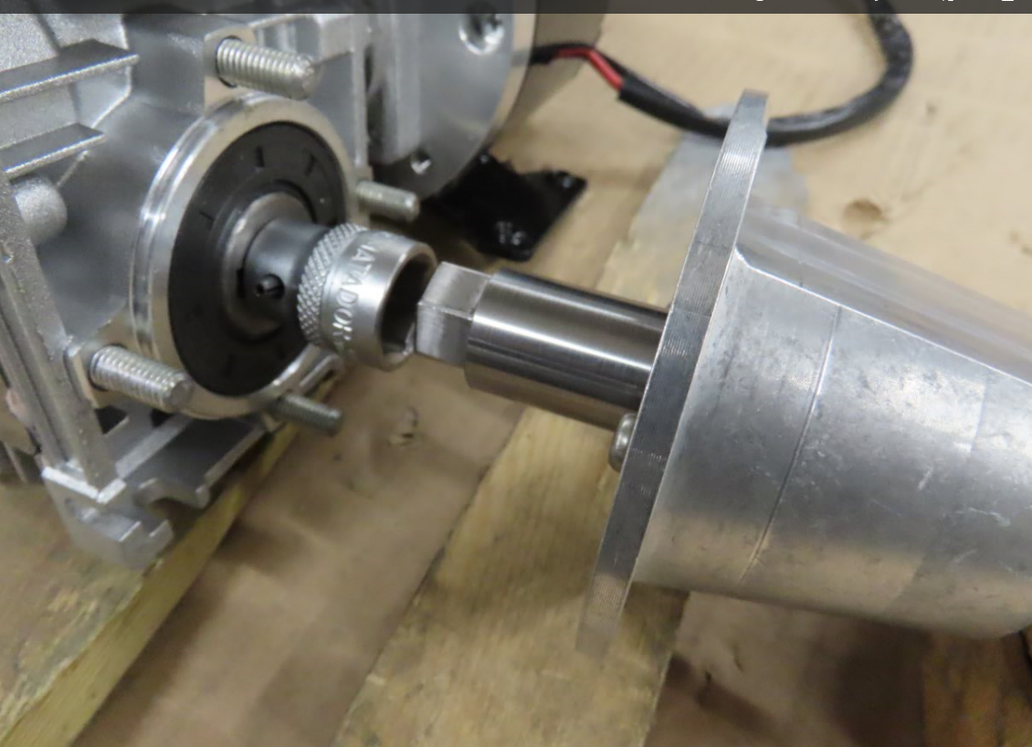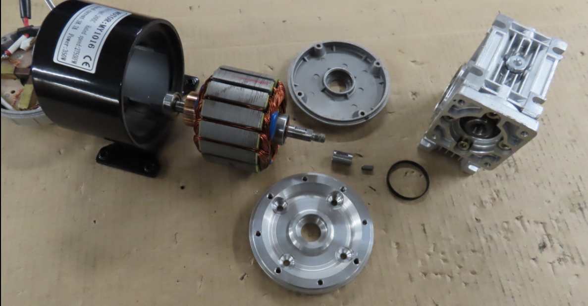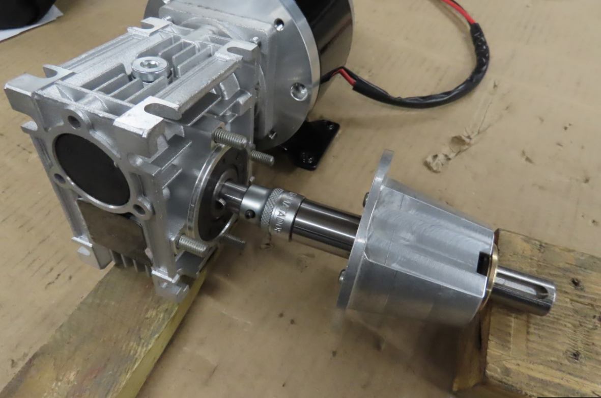 Drivmotorn som jag hade liggande fick modifieras med ny gavel och ändrad axelände så att den kan monteras direkt på snäckväxeln